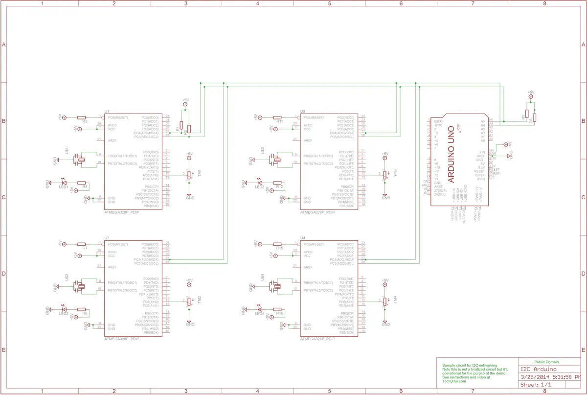 In this example, I have wired five Arduino (ATmega328) microcontrollers together via I2C protocol. Four Arduino slave units read from accompanying sensors then send their respective sensors' data to a master Arduino unit for processing. The Arduino example code has been enhanced with arrays and min/max constants with a few modifications to support any number of Arduino I2C nodes with any size payload, within the limitations of I2C in a Master Reader/Slave Sender configuration. When it comes to I2C, the headache is not in the wiring which is simple, but in synchronizing the I2C nodes and data transmission. I hope my code can simplify some of your Arduino networking.BACKGROUND
