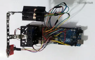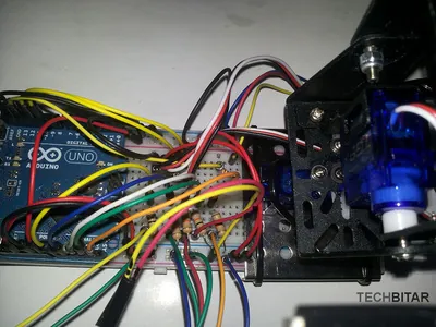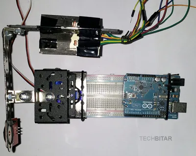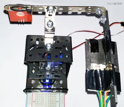 I used a metal base to hold the pan/tilt platform which I found in a cheap construction set. But you can use any other material such as wood if you prefer. What matters is the orientation of the servos, the correct wiring, the centering of servo horns, and the physical stability of the pan/tilt platform. When the servos rotate quickly, they can shake the whole breadboard to the point of dislodging components or forcing them out of alignment.