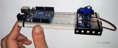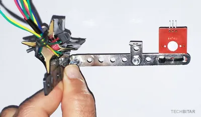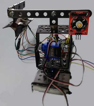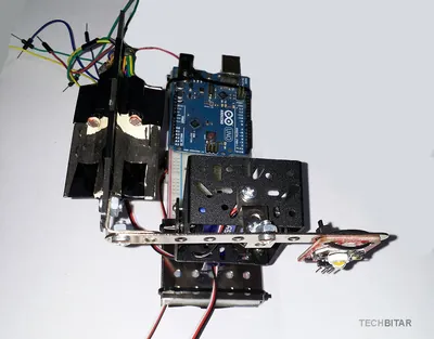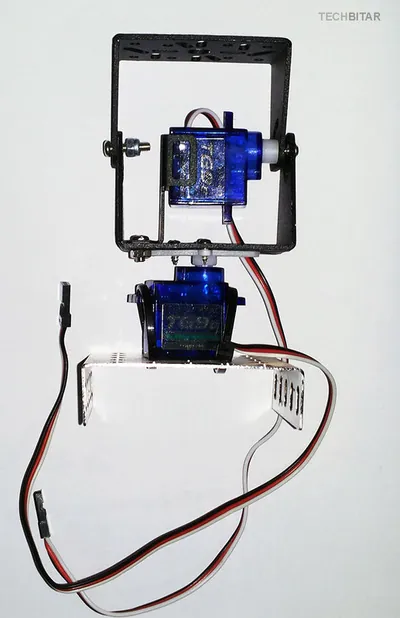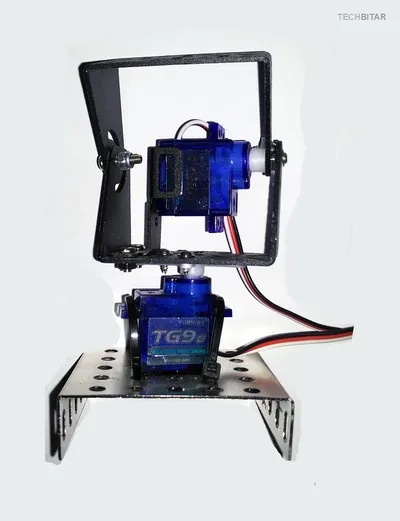 I used a metal base to hold the pan/tilt platform which I found in a cheap construction set. But you can use any other material such as wood if you prefer. What matters is the orientation of the servos, the correct wiring, the centering of servo horns, and the physical stability of the pan/tilt platform. When the servos rotate quickly, they can shake the whole breadboard to the point of dislodging components or forcing them out of alignment.